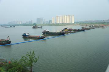 4月10日上午10點(diǎn),13艘作業(yè)船分布在供水管道的各個(gè)吊點(diǎn),開始進(jìn)行注水沉管作業(yè)。為控制管道的水量流速,每注水一次10分鐘,暫停約15分鐘。施工方根據(jù)管道和每個(gè)吊點(diǎn)的受力情況,從南岸往北岸注水,船上每一個(gè)吊點(diǎn)根據(jù)水量調(diào)節(jié)逐漸下沉。由于河床差異,鋼管需要沉入水下十幾米,對施工技術(shù)要求很高,整個(gè)過程持續(xù)了六個(gè)小時(shí)。